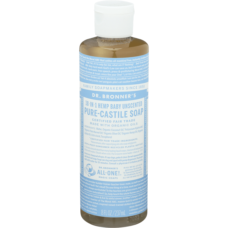 Dr. Bronner’s Castile soap & coconut oil. That’s all folks! I like fractionated coconut oil, any brand, meant for the body and not cooking.